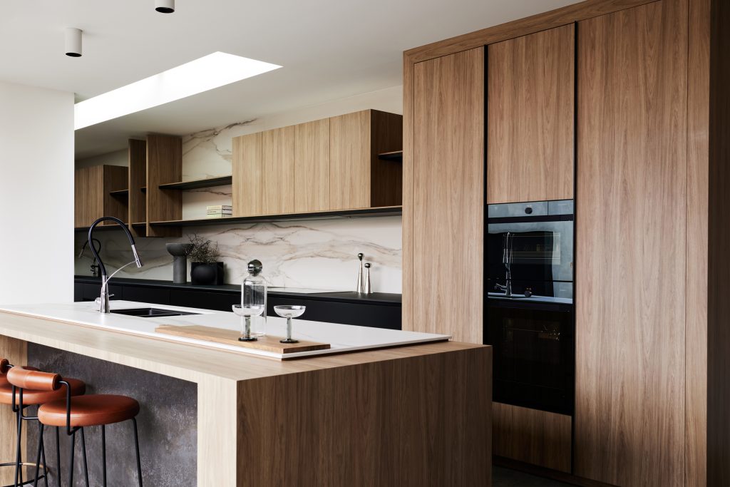 Wood veneer and warm whites balance sophistication and function, finger pull cabinetry, and seamless details.
